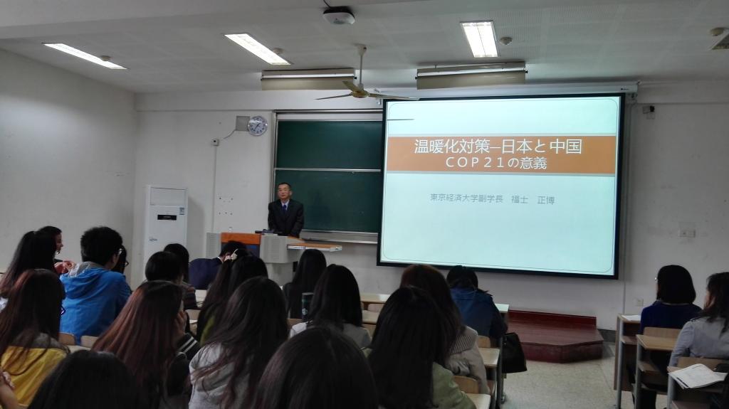 2015年11月4日,在我校二教举办“关于全球气温变暖及其应对措施”的讲座。这次讲座邀请了东京经济大学福士正博教授及校方代表,由JKF 捷克论坛